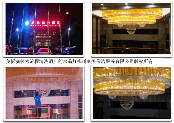 而清潔起來,是非常困難的,大多數(shù)用戶是采用拆(chāi)卸浸泡方式來清洗,這種清洗方式工作量極大,效率技低。致命(mìng)的是清洗後必須重(chóng)新(xīn)安裝(zhuāng),致使部分零件損壞和(hé)破碎。而且清洗過程耗費大量時間,影響正常營業。這種清洗方法實不可(kě)取,成本(běn)相(xiàng)當高.郴州水晶燈(dēng)清洗公司(sī)清潔服(fú)務有限公司,為解決這(zhè)一難題,經過多次的試(shì)驗,終於推出清洗燈具這(zhè)一(yī)業務。我們采用專用燈具清(qīng)潔劑,配合先進的噴射方(fāng)法,無(wú)須拆卸(xiè)燈具,清潔(jié)後水晶飾品幹(gàn)淨明亮,恢(huī)複原有光(guāng)澤,對金屬部分沒有破壞作用。重要的是,清洗成本比較低廉。如果(guǒ)您在這一方麵碰到難題,不妨聯係郴州91视频入口保潔服務水晶燈清洗公司(sī)幫忙解決(jué)。實力見證,工程案例:郴州和天下,溫德姆至尊大酒店,武漢黃石金花大酒店,永興裕榮國際大酒(jiǔ)店,郴州金沙俱(jù)樂部(bù),桂陽海天足浴城,等等(děng),都是大堂(táng)大餐的(de)大型水晶燈